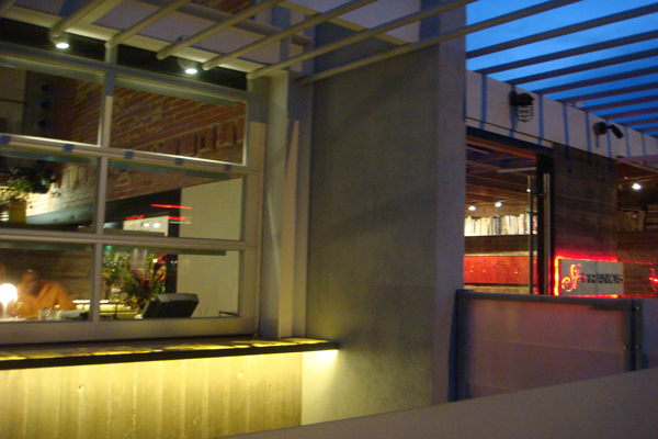 The main dining room is anchored by a long bar, fit equally for drinking or dining. Immediately behind the bar exists the restaurant’s trophy design feature: a towering, glass, two-level, garage-like door intended to be rolled up during Phoenix’s more agreeable weather months. Outside, an expansive, walled-in, gravel patio area presents itself for future usage as both an extension of the bar area, as well as outdoor dining, once the hotter weather subsides.