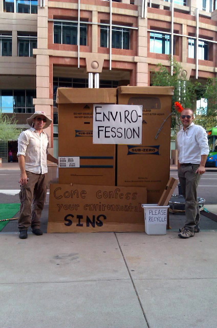 The vision started by Rebar six years ago manifested itself on Washington Street, across from City Hall, on the morning of September 16. These nine “parks” had themes ranging from my “Wonka Park,” filled with fake lollipops and giant mushroom chairs, to a bike park offering to fill up tires and tighten loose components. There was an “Enviro-fession” booth set up by Midtown residents Richard Darby and Dovid Gorman where people passing by could confess their environmental “sins,” and a more traditional park with trees, lawn chairs and a trampoline set up by Stacey Champion of Rogue Green, who organized and publicized the event.