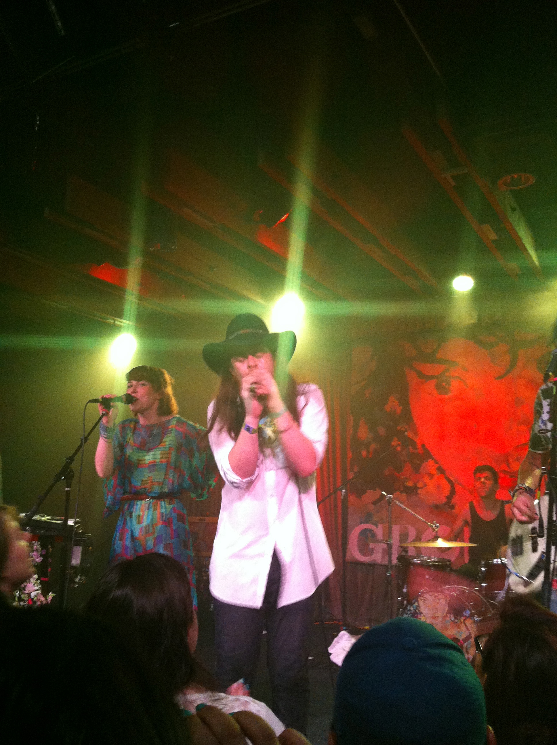What the band wore: Givers wore an assortment of plaid button downs, v-necks, and screen-printed T-shirts. Grouplove were more classic hippy than hipster with their fashion, with Zucconi in a flow-y floral button down, and Hooper in a breathy green patterned dress and kick-ass studded black short boots. Rabin took the prize for most unique, however, in a tank top, black leggings, and tall, patterned socks with — I think — bears on them. (It looked like the bear from California’s state flag, but it was too hard for me to tell.)