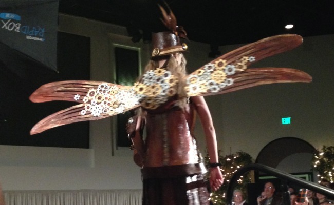 Weighing at least 40 pounds, Herr decked her model from head-to-toe, as the outfit included a chocolate corset, a skirt of modeling chocolate, and wings constructed out of a light balsa wood and then coated in chocolate. Herr sewed each leaf of the skirt by hand onto the model (all were local students) in the hour leading up to the show. Since chocolate melts at body temperature, the ultimate challenge was not leaving the model covered in a sweet brown mess. Wearing a simple leotard as a barrier, the rest of the outfit was a confection out of every chocolate lover’s dream.