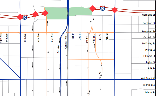 The plan area encompasses downtown Phoenix, bounded by McDowell Road on the north, Buckeye Road on the south, Seventh Avenue on the west, and Seventh Street on the east. It also will include the freeway loop between Interstate 10 (I-10) and Interstate 17 (I-17) surrounding the downtown core.