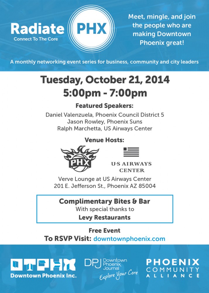 Join Downtown Phoenix business, community, and city leaders on October 21 for RadiatePHX, the free downtown networking event that invites you to “connect to the core” on the third Tuesday of each month.