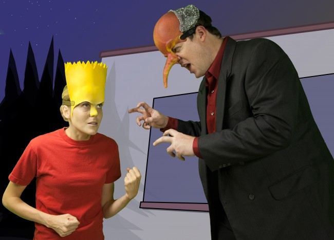 With an eight-person cast ably supported in the third act by three musicians — Lali Breen, Jeremy Brunansky, and Ron Foligno — Mr. Burns uses the “Cape Feare” episode as its focus. “It’s like going inside an onion,” says Steak. “You’ve got the original [1962 Gregory Peck] Cape Fear movie, you’ve got the [1991] DeNiro version of the Cape Fear movie, then you’ve got the Simpsons’ spoof of the DeNiro Cape Fear movie, and then you’ve got this show, so that’s a lot of layers.”