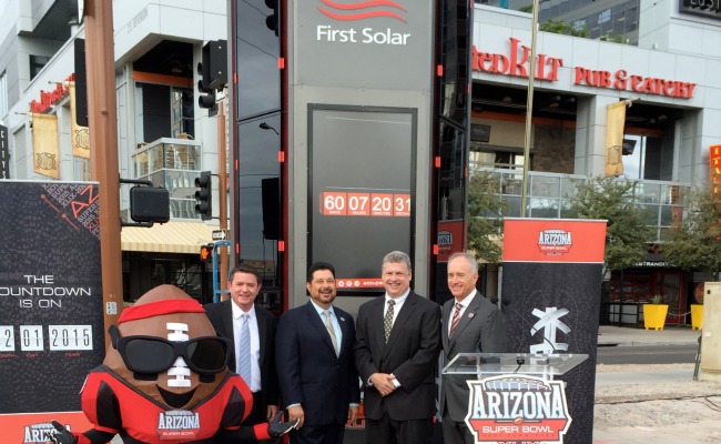 To build on the growing momentum and anticipation of Super Bowl XLIX the Arizona Super Bowl Host Committee and First Solar, Inc. unveiled the First Solar Countdown Clock in downtown Phoenix this morning. Over the next 60 days, the technologically advanced clock will provide the countdown to kick-off and keep fans “in the know” about events and activities coming up on the free, 12-city block fan campus known as Super Bowl Central.