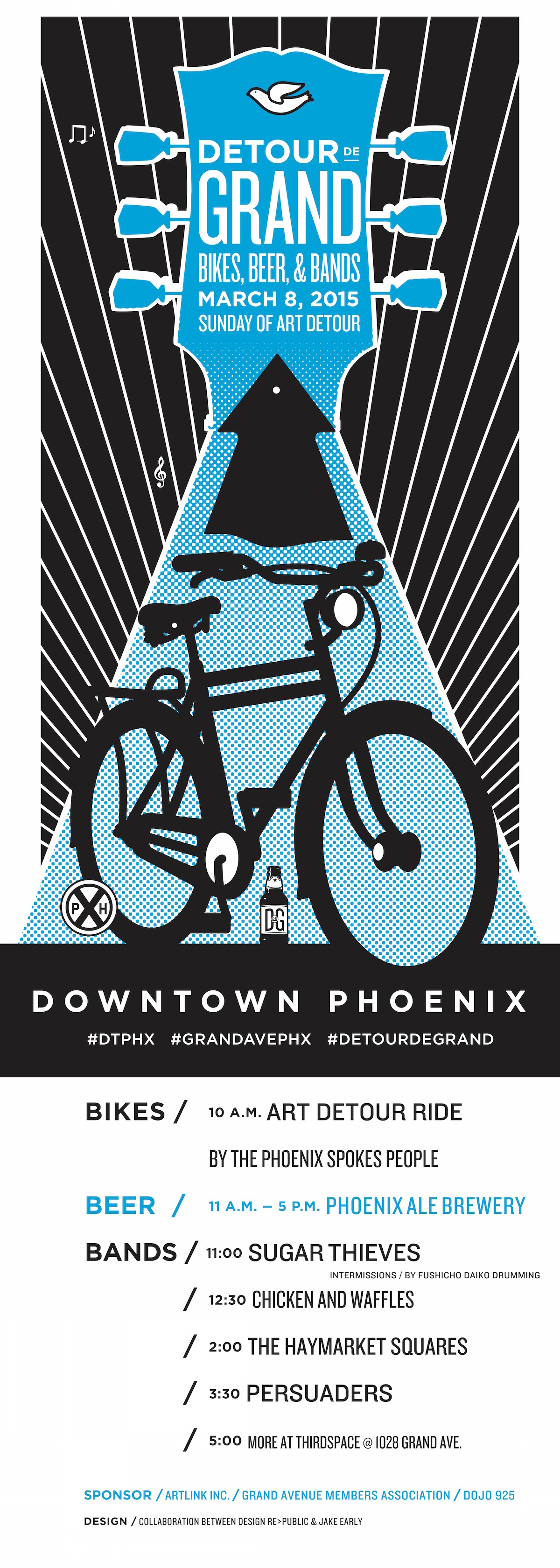 DeTour de Grand sponsors to date include: Phoenix Brewing Company, Arizona Multibank Corp., Arizona Preservation Foundation, Artlink Inc., Butler Housing Corp., Carnagan LLC, Dunlap-McGee Management Co., Edge Industries, Grand Avenue Pizza Company, Habitat Metro, KS State Bank, Local First Arizona, Oasis on Grand Apartments, State Representative Debbie McCune Davis, and The Carmody Company. The poster and design materials for DeTour de Grand were designed by Design RePublic, a studio off Grand Avenue, and local artist Jake Early. Signed screen-printed posters will be available for sale at the event.