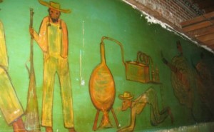 On the Roosevelt walls, a smaller mural shows a dancer twirling in a glass, while the huge 40-foot work depicts scenes of alcohol production, from loincloth-clad figures gathered around a cauldron to a hillbilly moonshine still. “Everybody’s making some kind of booze,” says Laber. “That seems to be the theme of the mural.” Both pieces feature opaque greenish-turquoise backgrounds, and while the dancer is painted on drywall attached to wood studs, the alcohol scenes were applied directly to a very thin layer of plaster adhering to a double- brick wall.