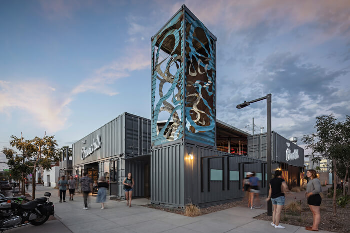 The marketplace is complete with a 30 foot vertical container sculpture by local Phoenix artist, Peter Deise.