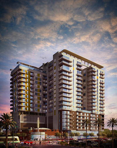 Delivering in early 2019, The Stewart is a 19-story luxury high-rise apartment community with mid-century appeal. Located in the heart of the Roosevelt Row district, the mixed-use development will total 325,000 sf including 6,300 sf of restaurant and retail space.