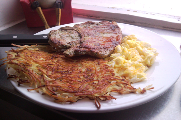 Triumphantly, my breakfast entered the room (given the size of the place, I could have probably watched her put it on the plate). Inadvertently, I heard trumpets sound. This breakfast looked glorious. I could barely contain myself. I snapped a few pics to document the occasion, because nothing would remain, and then I dove in. The eggs were fluffy and delicious. The giant pork chop was cooked to perfection. Even if your stomach gets full at this early stage, they plop a large quantity of hashbrowns that are cooked to perfection — buttery middles with browned outsides — and some fantastic buttered toast and jam right beside you. Matt’s is simply not playing around with your hunger. It’s crushing it.