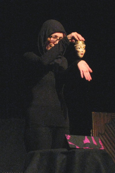The first puppet show up for the evening was performed by Nataliya Khusid, who is from Russia and now resides in Detroit. The piece was entitled “L’Histoire d’Amour,” a beautiful French love story portrayed with two small hand-face puppets and French music. It was simply gorgeous to watch, as her hands mimicked the bodies of these faces and showed us a story about a woman reluctant to fall in love and a man persistent enough to pursue her until she gave in.