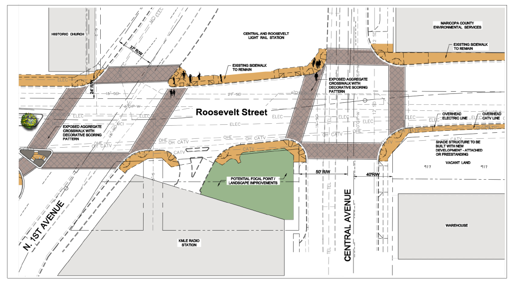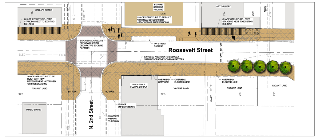 to discuss the Roosevelt Row Streetscape Improvements project. The plans, which focus on Roosevelt Street between Central Avenue and 4th Street, aim to make Roosevelt Row more pedestrian friendly and aesthetically pleasing. Below are the latest renderings for the project.
