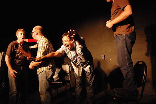 Some people, like ShanMan during their opening weekend and yours truly the weekend after, were part of the experience. Every Saturday night Torch presents the Neighborhood, which consists of one person telling one story at a time–on stage–each based on an audience suggestion. Torch uses the material for three to five sketches and then the monologist hops back on stage for another story, which is followed by more sketches.
