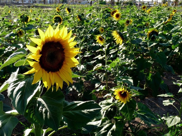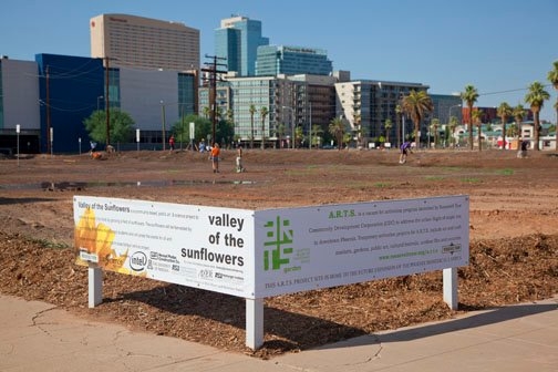 In August 2011, Roosevelt Row Community Development Corporation (CDC) leased a vacant parcel in the Evans Churchill neighborhood in downtown from the City of Phoenix to grow a 2-acre field of sunflowers. Today the sunflowers are blooming!