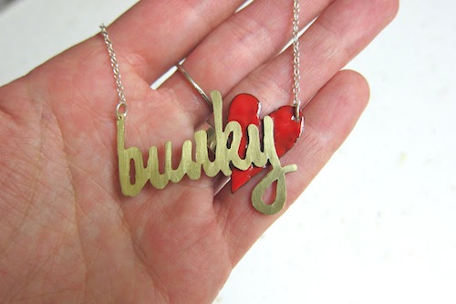The collection features the classic Bunky Heart Sterling Necklace (pictured below) and will rotate in other designs every so often. The classic necklace is made from brass, red enamel and sterling silver.