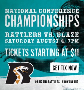 The Arizona Rattlers have secured home field advantage for the 2012 National Conference Championship. The Rattlers will face-off against the Utah Blaze on Saturday, August 4 at US Airways Center. Kick-off is scheduled for 7:00 p.m.