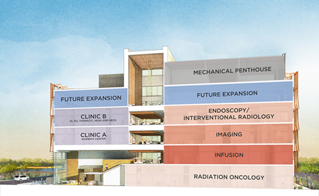 The 220,000-square-foot, five-story, $100 million facility will offer comprehensive cancer services, including infusion, radiation oncology, diagnostic imaging, endoscopic/interventional radiology, a women’s center, specialized cancer clinics, patient wellness and support services, a prevention/executive health clinic, clinical lab space and other related support spaces.