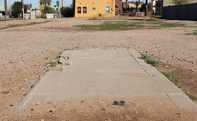 It’s no news to anyone who lives in downtown Phoenix that there are a ton of vacant lots. I am deeply familiar with all of the ones in my Garfield neighborhood. I have photographed them, walked across them and located the remaining debris of homes on them. They are a very real part of the structure here and are more than just undeveloped areas of desert. They are built-upon, once-used, stripped clean, recovered with gravel and continuously trimmed and maintained pieces of land.