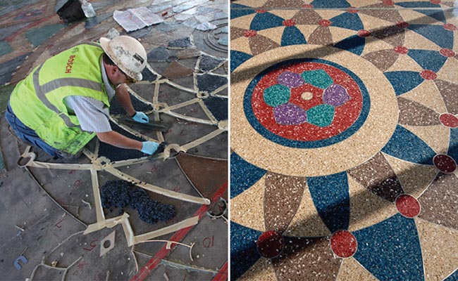 In highlighting the five-year creative collaboration that produced the terrazzo, the exhibition features a video documenting the process behind the projects, design drawings, computerized models, large graphics and hands-on exhibits. Audio clips enable visitors to hear the artists’ and fabricators’ insights about how the floors were built through 40,000 hours of labor by hand.