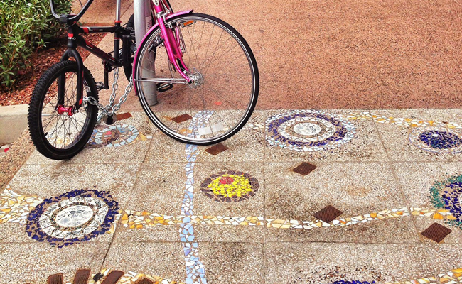 Trained as a potter in college, Lebow confesses he “fell off the wheel” to explore other endeavors, but his personal and physical relationship with created works is evident. As a potter applies glaze, he describes the Taylor Streetscape as layers of experience. “The sidewalks are expanded and embedded with artwork to encourage strolling. So touch may be the first sense engaged. Trees are a vital part of the design and set in wide basins, capturing and reflecting water during rainy seasons. Pedestrians hear the sound and feel the cool breeze through their branches. Or they smell the plants as they respond to changes in atmosphere.” In this way, the art lives in the community.