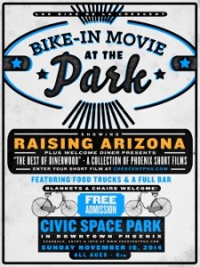On Sunday night, Civic Space Park will play host to “Bike-In Movie at the Park,” another FREE event featuring food trucks, a full bar, and a screening of the Coen Brothers film Raising Arizona, along with “The Best of Dinerwood,” a collection of Phoenix short films presented by Welcome Diner.